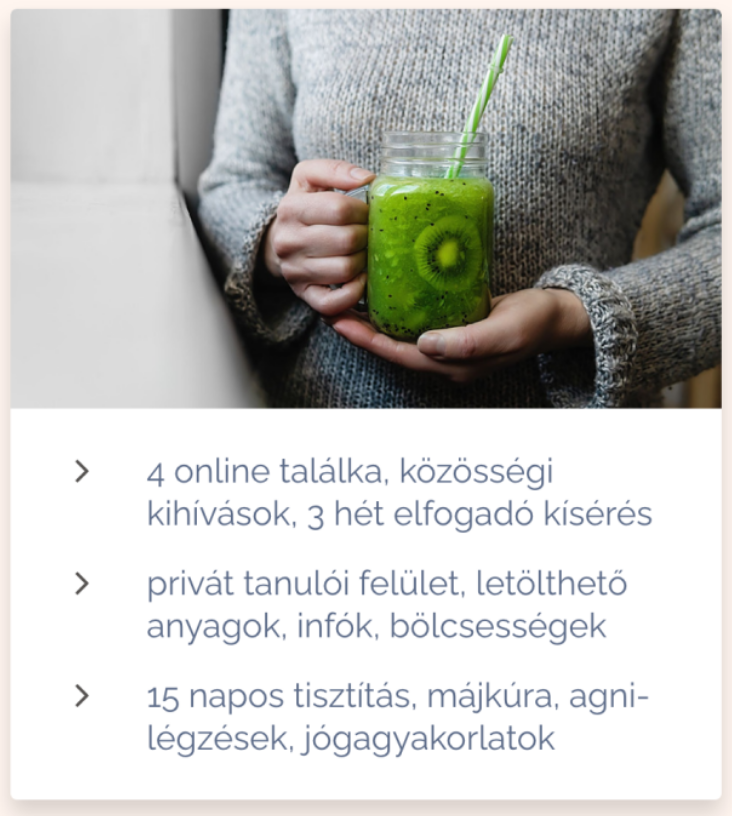 Pár napnyi ráhangolódással indítunk, mert tapasztalatom szerint a sikertelen kúrakísérleteinknek a legtöbbször a kapkodó, “hirtelen felindulásból” elkövetett, intenzív, de hamar kihúnyó lelkesedés az oka. Megéri tehát ez az egy pár nap praktikus készülődés és mentális ráhangolódás, mert ez adja az alapot, és a megtartó keretet. Figyelem: mivel ez előkészületi hét, csatlakozni a programhoz a kúrakezdés előttig még lehet, tehát a legkésőbbi csatlakozási határidő 2026. ápr. 12. éjfél. - KÚRA BLOKK: